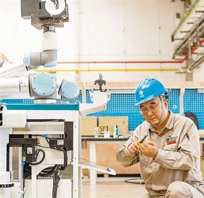 国网天津滨海公司运检部配电运检室配电抢修班班长张黎明对配网带电作业机器人进行技术调试。武少民 李 津摄影报道