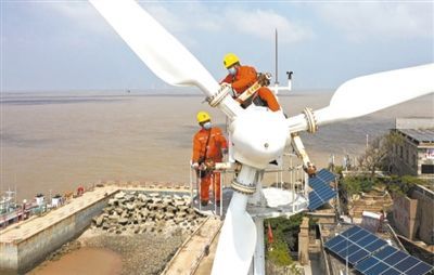 江苏省连云港市灌云县开山岛上,来自国网灌云县供电公司的电力检修人员对岛上的30千瓦风电机组进行检修维护。任义刚摄(影像中国)