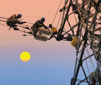 国网江西省萍乡市上栗县供电公司施工人员在杨岐乡黄冲村10千伏关城线铁塔之间进行高空放线作业。邓建萍摄(影像中国)