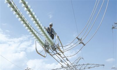 南方电网云南输电分公司带电三班高级作业员郑瑞东在离地面30多米的高空带电作业现场更换电力组件。罗艾桦 苏海涛摄影报道
