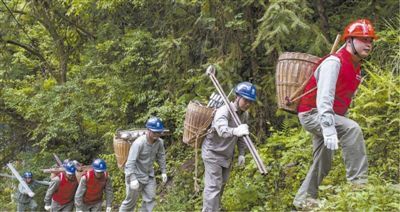 湖北省利川市谋道镇,谋道供电所党员服务队队员背着电力维修器材行进在山路上。陈小林摄(影像中国)